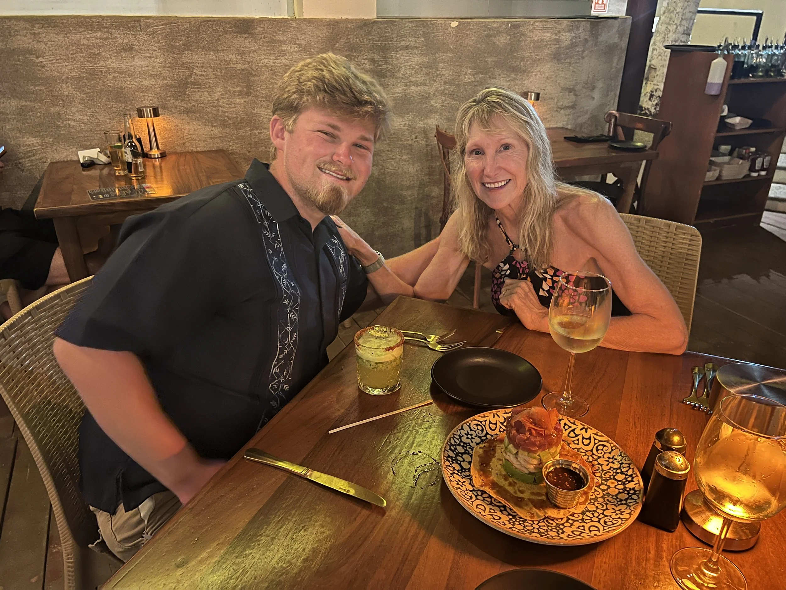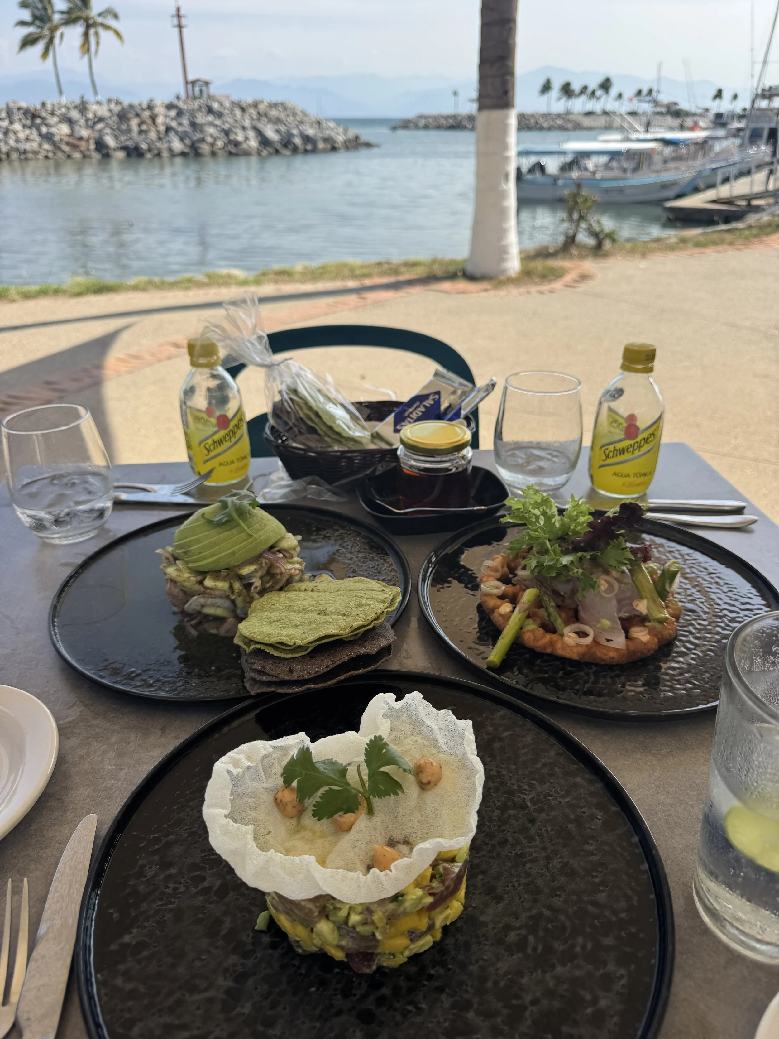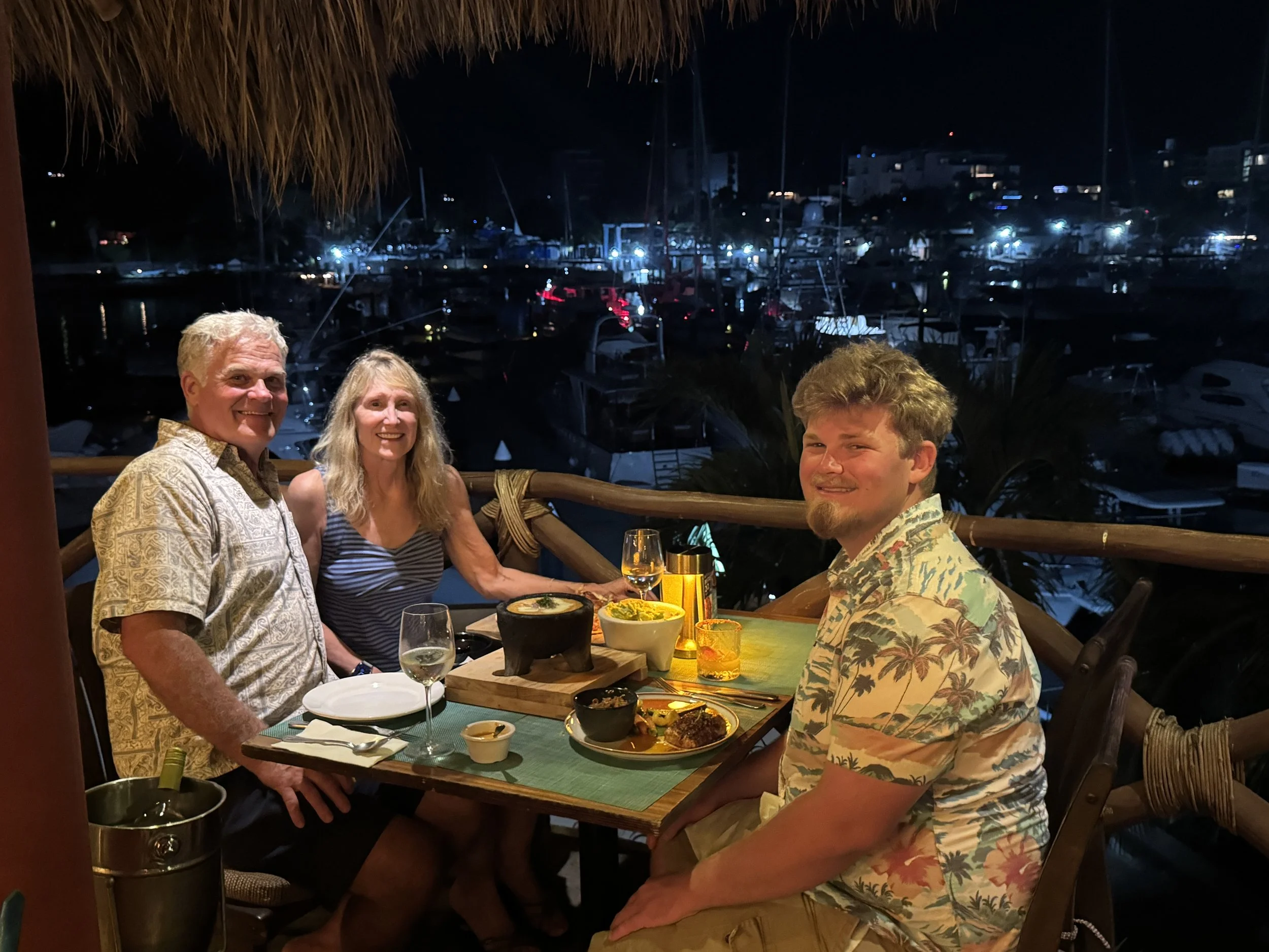 That evening, we took a taxi north along the coast to Punta Mita for dinner at La Pescadora, a spot highly recommended by Mark. The drive took about 25 minutes, during which our driver, Ismael, shared stories about his life in Mexico and his time living in Pomona, California. The waterfront, open-air restaurant was stunning, and we arrived just as the sun dipped low, casting its final golden glow across the bay.