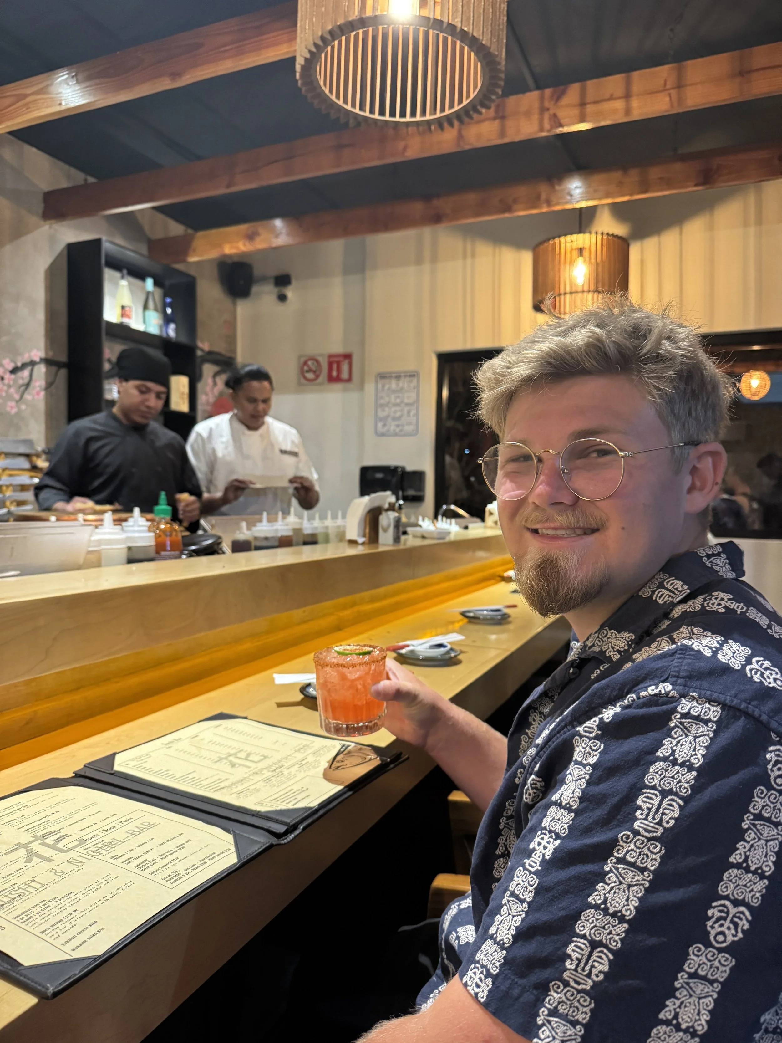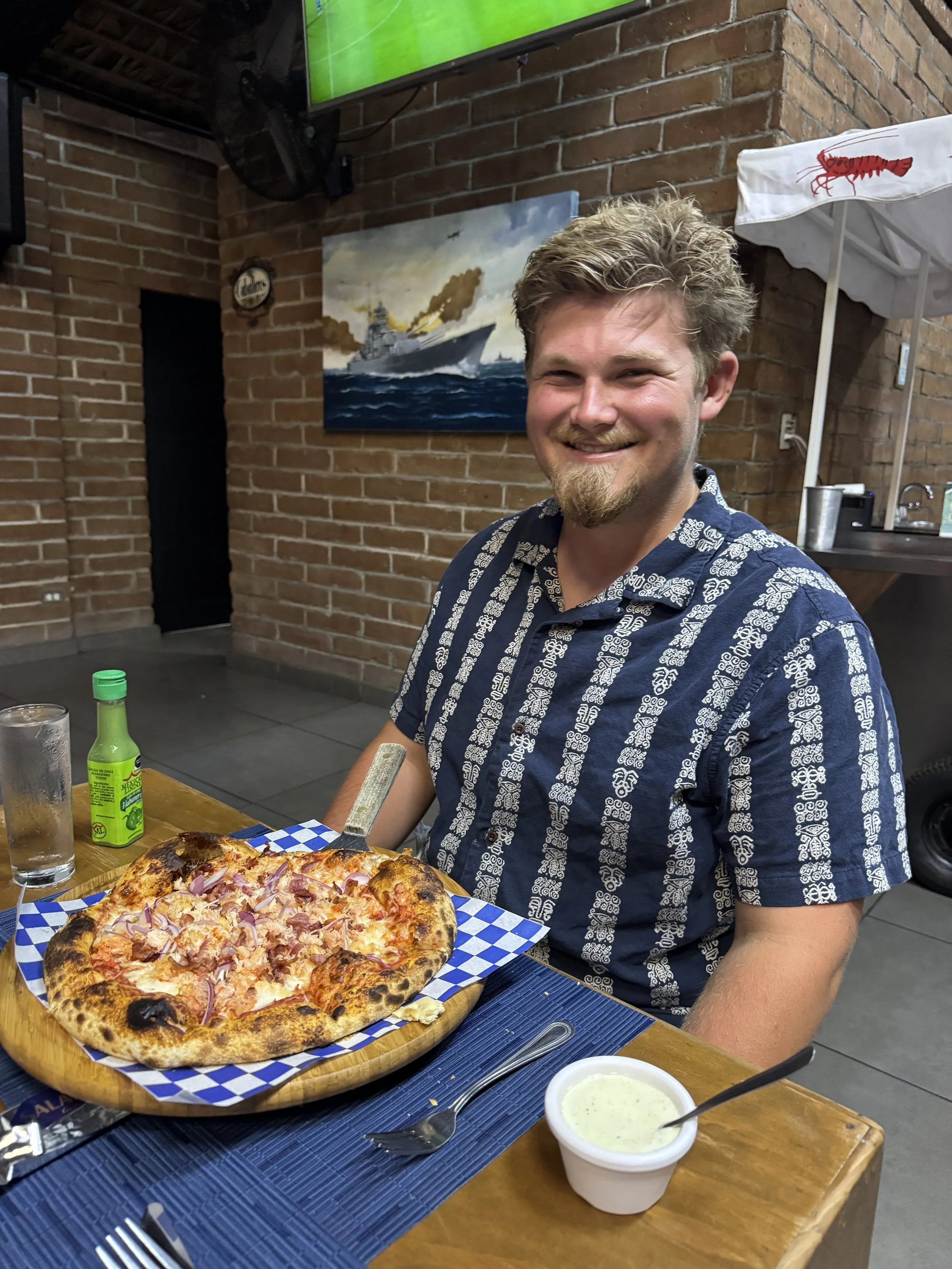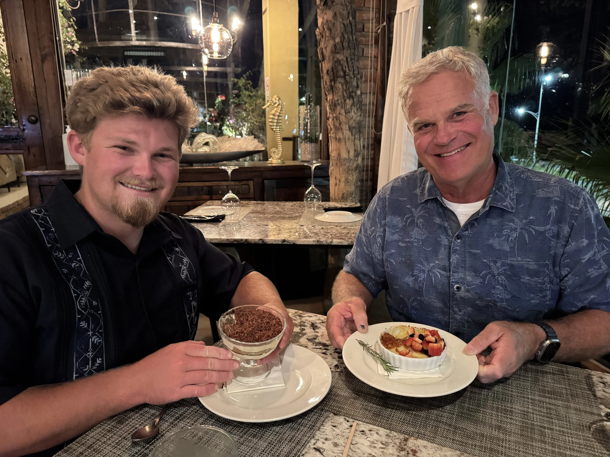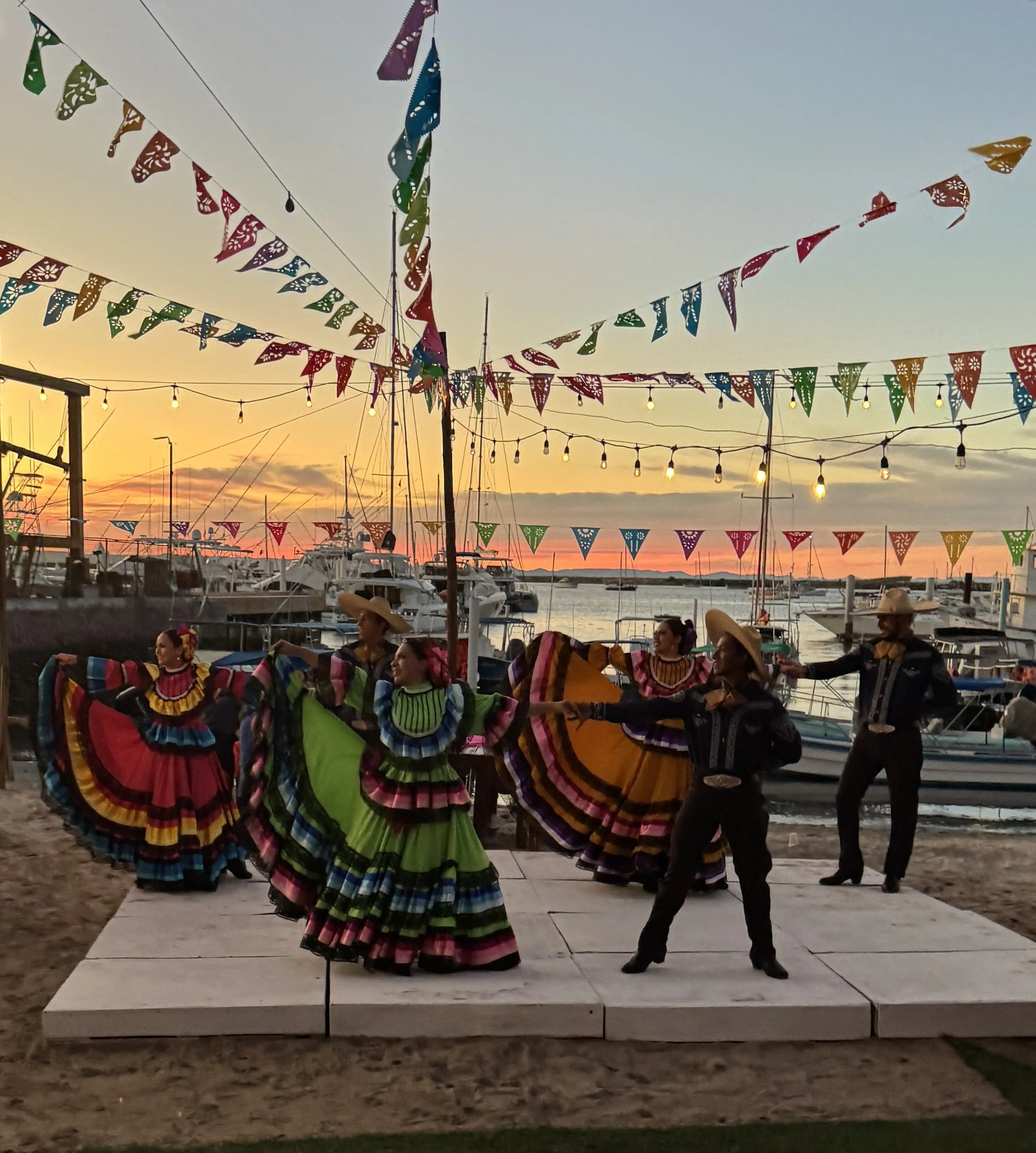 That evening, we took a taxi north along the coast to Punta Mita for dinner at La Pescadora, a spot highly recommended by Mark. The drive took about 25 minutes, during which our driver, Ismael, shared stories about his life in Mexico and his time living in Pomona, California. The waterfront, open-air restaurant was stunning, and we arrived just as the sun dipped low, casting its final golden glow across the bay.