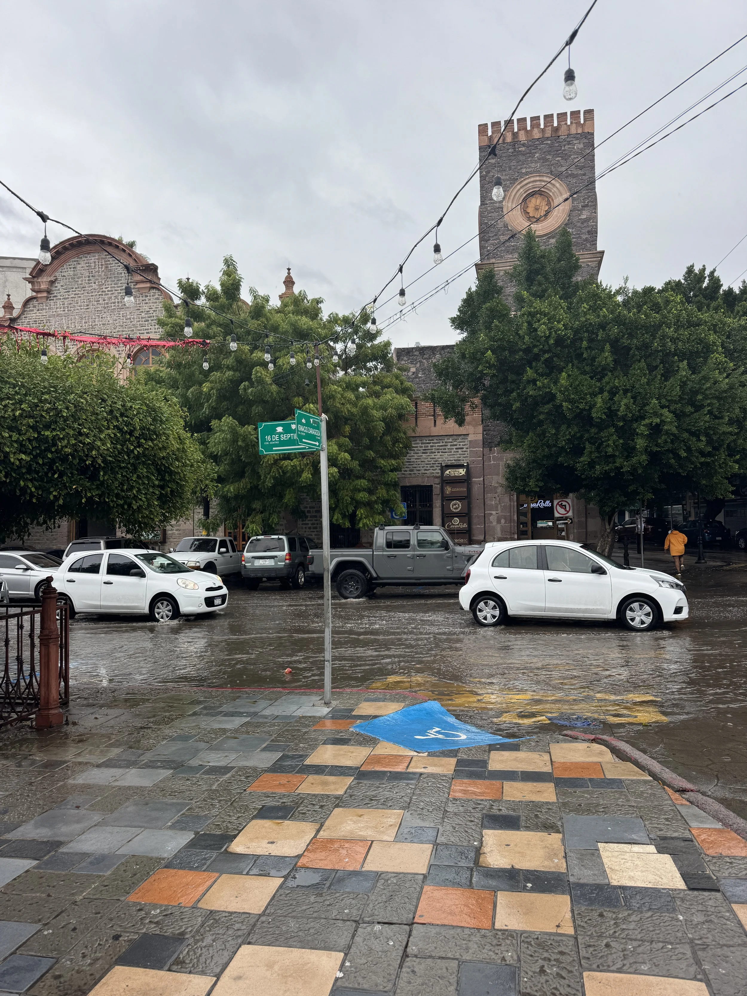 Just like the night before, the streets were severely flooded—so much so that crossing them guaranteed soaked feet. The guys charged ahead without hesitation while Barb and I paced up and down the sidewalk like two indecisive cats, searching for any dry route across. When it became clear there was no such thing, we finally tiptoed our way through the water, much to the amusement of a group of police officers watching from the curb.