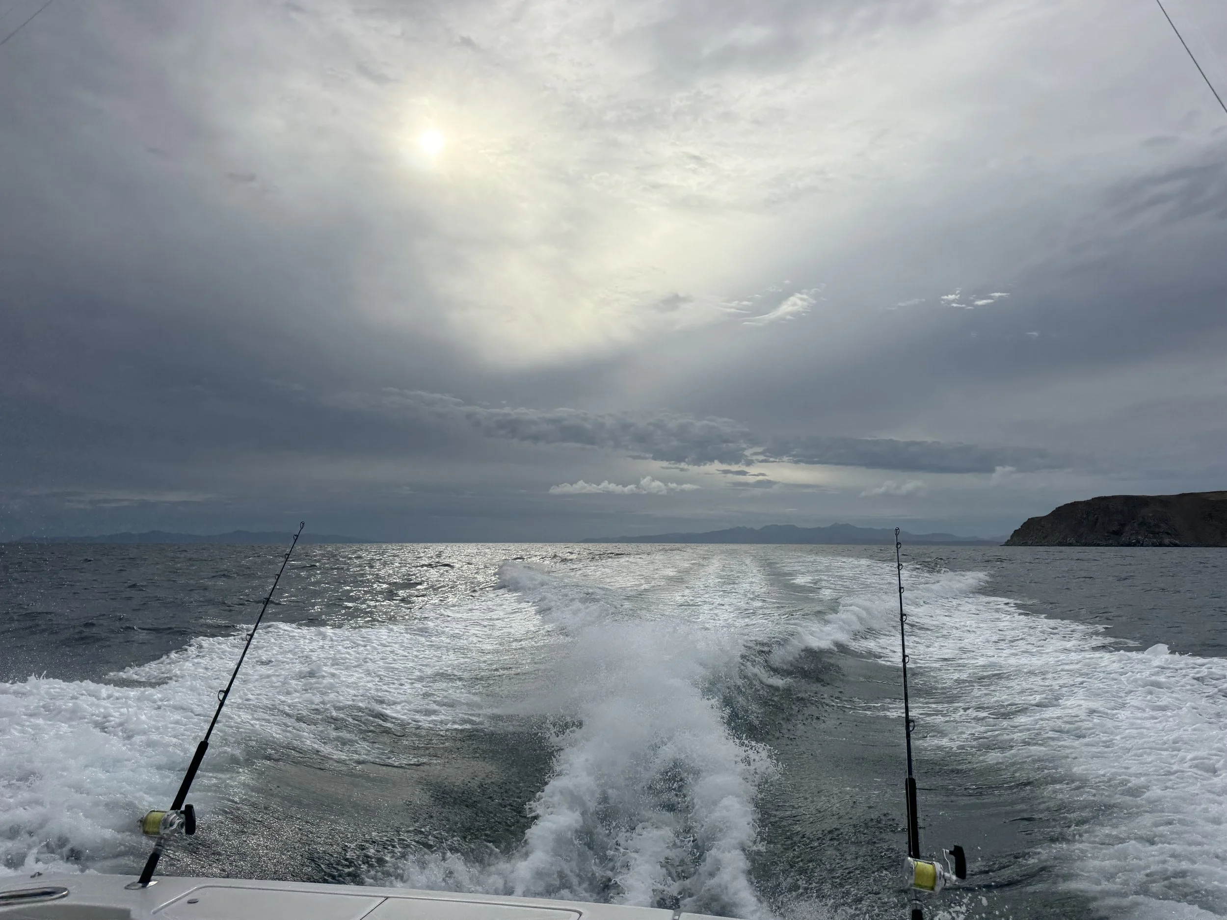 But just as we prepared to fish, we noticed an issue—the bait tank wasn’t circulating water properly. Roberto tried to troubleshoot, but the pump refused to cooperate. Even so, we pressed on, fishing rail-to-rail, hopeful but not particularly lucky. At one point, an excited flock of seagulls led us to a violent boil of tiny triggerfish being chased by enormous Cubera Snappers, but even that frenzy didn’t translate into hits for us. It looks like Chris will be returning to La Paz to fulfill his dream.