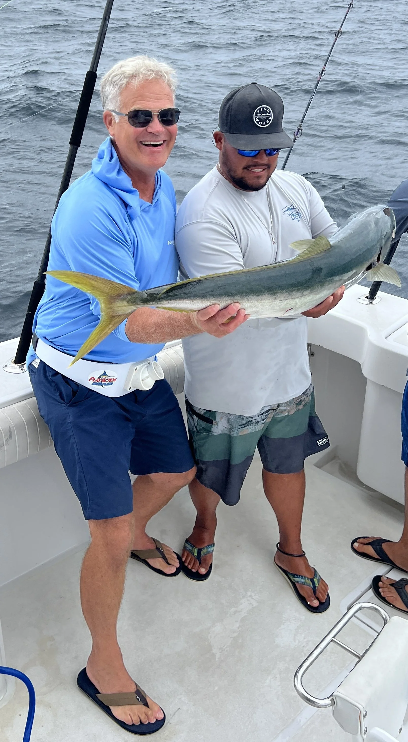 We relished another warm day on the water, and fishing provided good entertainment. Although we have Starlink, we must pay an extra fee for priority service when we are more than 12 miles offshore. Suddenly, we hooked a tuna! Morgan was excited to bring in our first yellowtail, while John, our expert gaffer, made sure it made it on board. We celebrated the sashimi in our future.