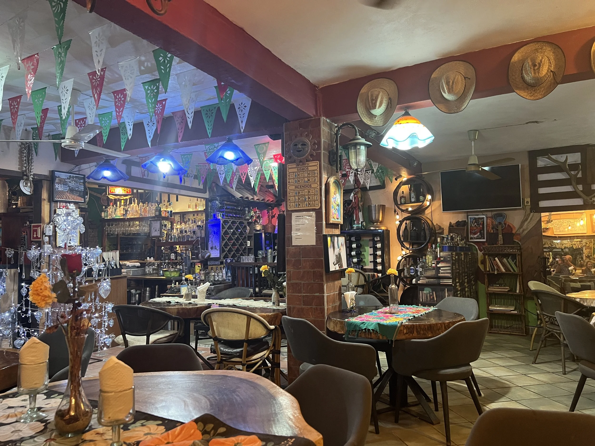 Hungry for a great meal, we stumbled upon Cueva, a traditional Mexican restaurant set inside an impressive cave. The interior was filled with rustic wood-trunk tables and decorated with every Mexican artifact imaginable—calaveras, sarapes, jarras, tequila bottles, guitars, and more. It was a visual feast, yet surprisingly, we were the only diners, aside from the owners’ family. The waiter explained that they had been busy earlier in the day due to the holiday.