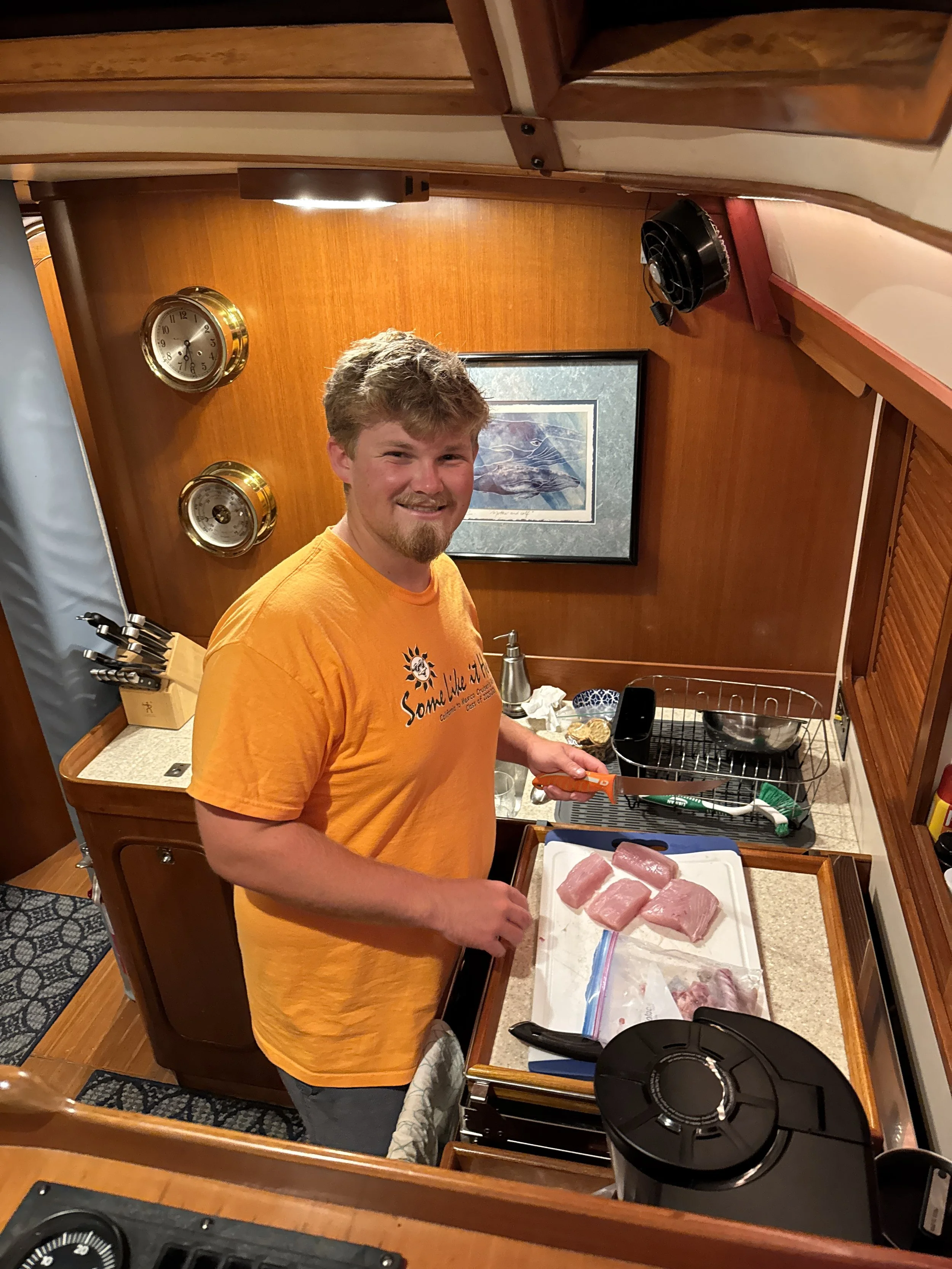 Back on the boat, we rested briefly before diving into preparations for our onboard dinner party. Chris arrived with his usual enthusiasm, ready to orchestrate another culinary masterpiece. Dylan took his role as sous chef seriously, staying close by to learn the techniques and secrets passed down from his newly appointed “Codfather.” The feast did not disappoint—tuna sashimi, pan-fried tuna, garlic broccoli, and coconut rice filled the cabin with irresistible aromas. As Barb wisely shared, “Nothing tastes better than catching and eating your own fish.”