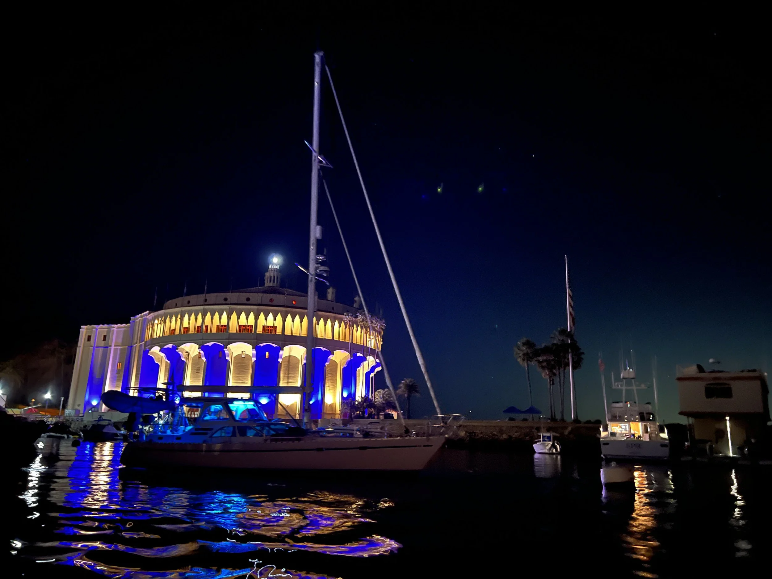 We awoke to a beautiful day in SB Harbor. The sky shone with deep crimson and gold hues, the seas were calm, and a monstrous cruise ship basked in the sunlight. Our journey to Avalon was easy and much warmer than I remembered from our summer trips. We were entertained by distant whales and friendly dolphins who danced playfully. Having recently completed a digital photography class, Dylan applied his new skills, capturing the artistic side of our journey. I received new Apple headphones, a surprise from the “Sailing Santa,” which helped buffer the engine sound while resting. We gratefully snacked on delicious treats gifted by caring friends, and there was a bit of napping as well.