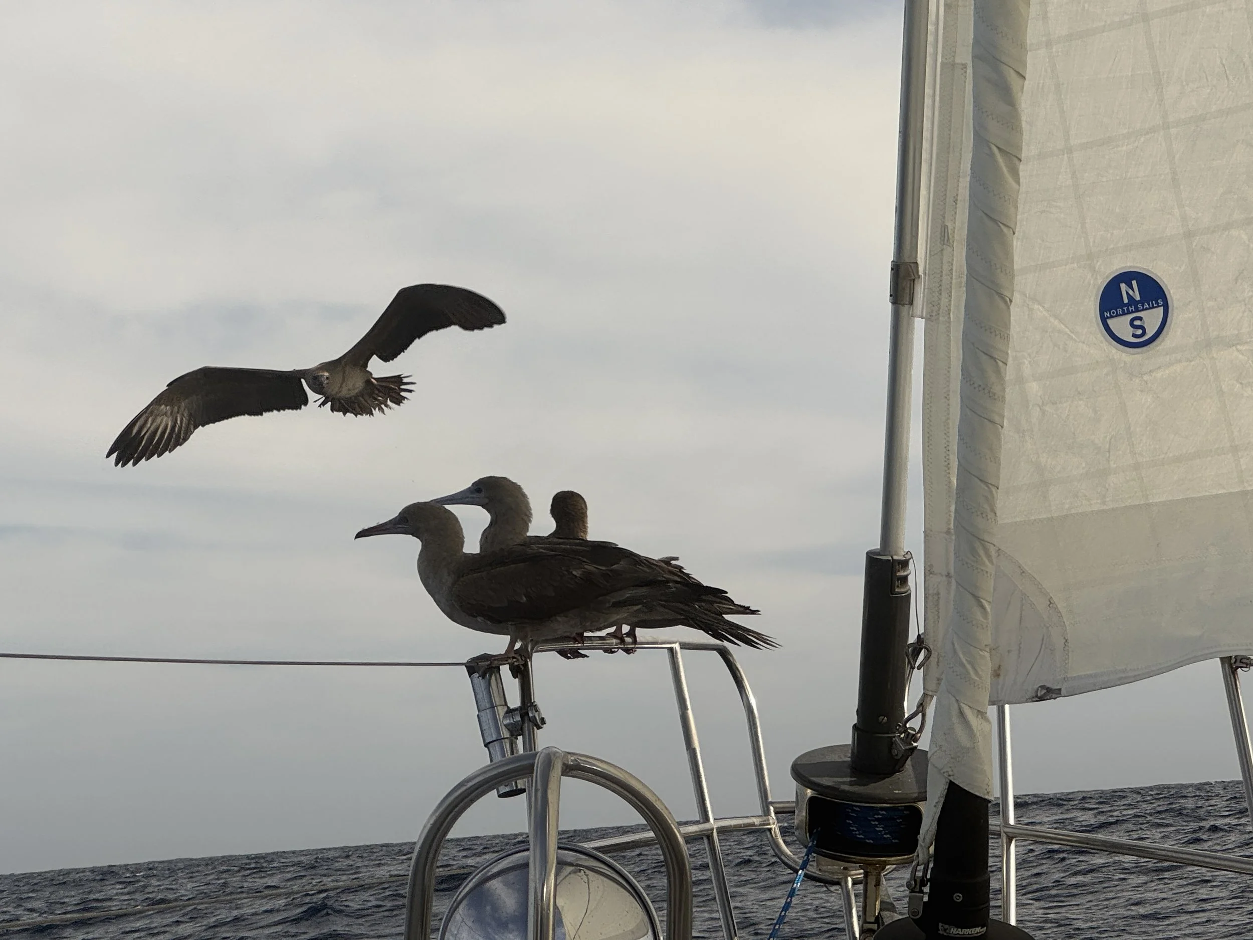 By 3 p.m., conditions had mellowed enough for Dylan to drop in the fishing lines, though no action followed. As the afternoon faded, we began preparing our “travel meal”—a comforting pot of chili, while the juvenile boobies provided us with “TV entertainment” as they played an enthusiastic game of king of the hill. After a flurry of jostling, squawking, and downright dirtiness, the alpha male claimed the prime rail space, inviting only a couple of his chosen companions to remain for the overnight passage.
