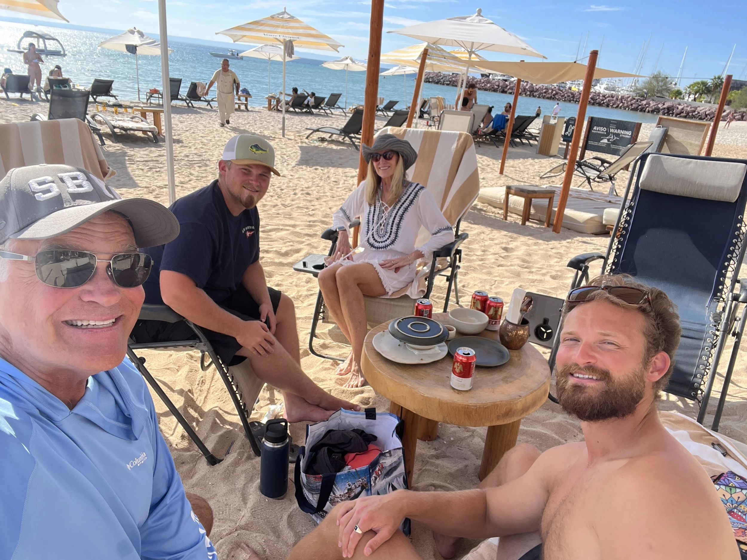 Today is the scheduled BajaHa-Ha Cruiser beach party. In the morning, we hung out onboard taking care of odds and ends and admiring the dolphins and seals who playfully cruised by Nirvana. John installed wheels on our dinghy, so we felt confident taking it to the beach versus hiring a panga taxi. With Dylan’s foot still injured, we wrapped a trash bag around his foot and sealed it with duct tape. We arrived at the beach and, thanks to the manly muscle power of our crew, were able to haul a very heavy dinghy/engine onshore.