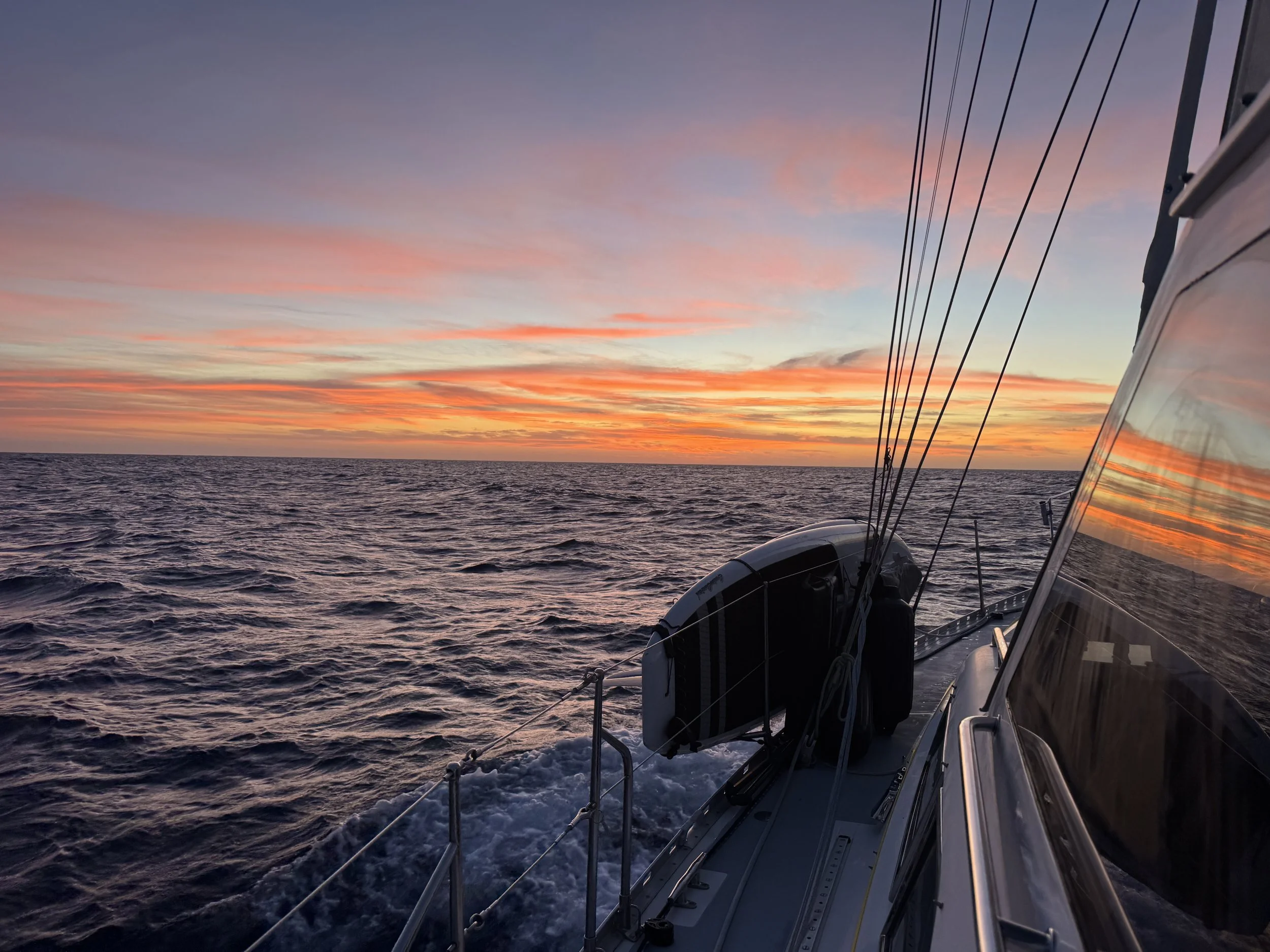 As predicted, Mr. Toad’s Wild Ride was not over yet. With similar conditions, we foraged ahead, wind on the stern and waves hitting us from side to side. This caused the sail to swing abruptly from side to side, creating a thunderous and unsettling crash. At midnight, John changed our heading, a welcome decision that would lengthen our trip a little but provide more comfort. On a happier note, my new friends Luna and Miss Sun did not disappoint, gracing the skies with their dramatic entrances and providing the highlight of night and early morning watch.